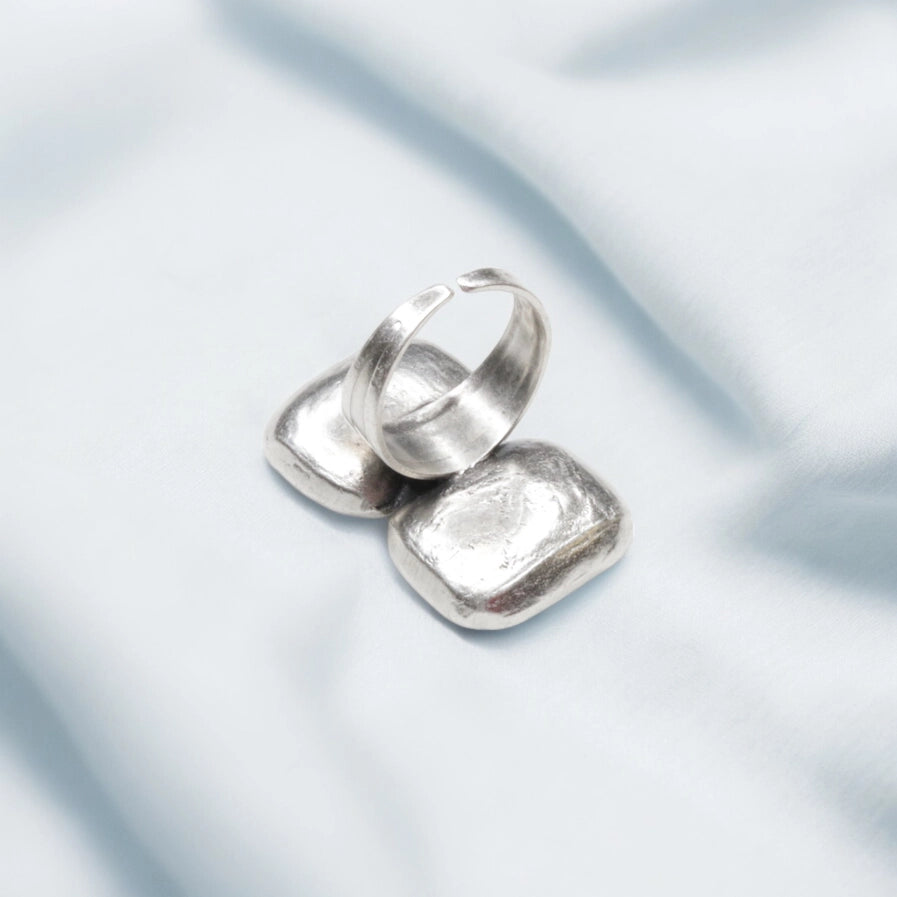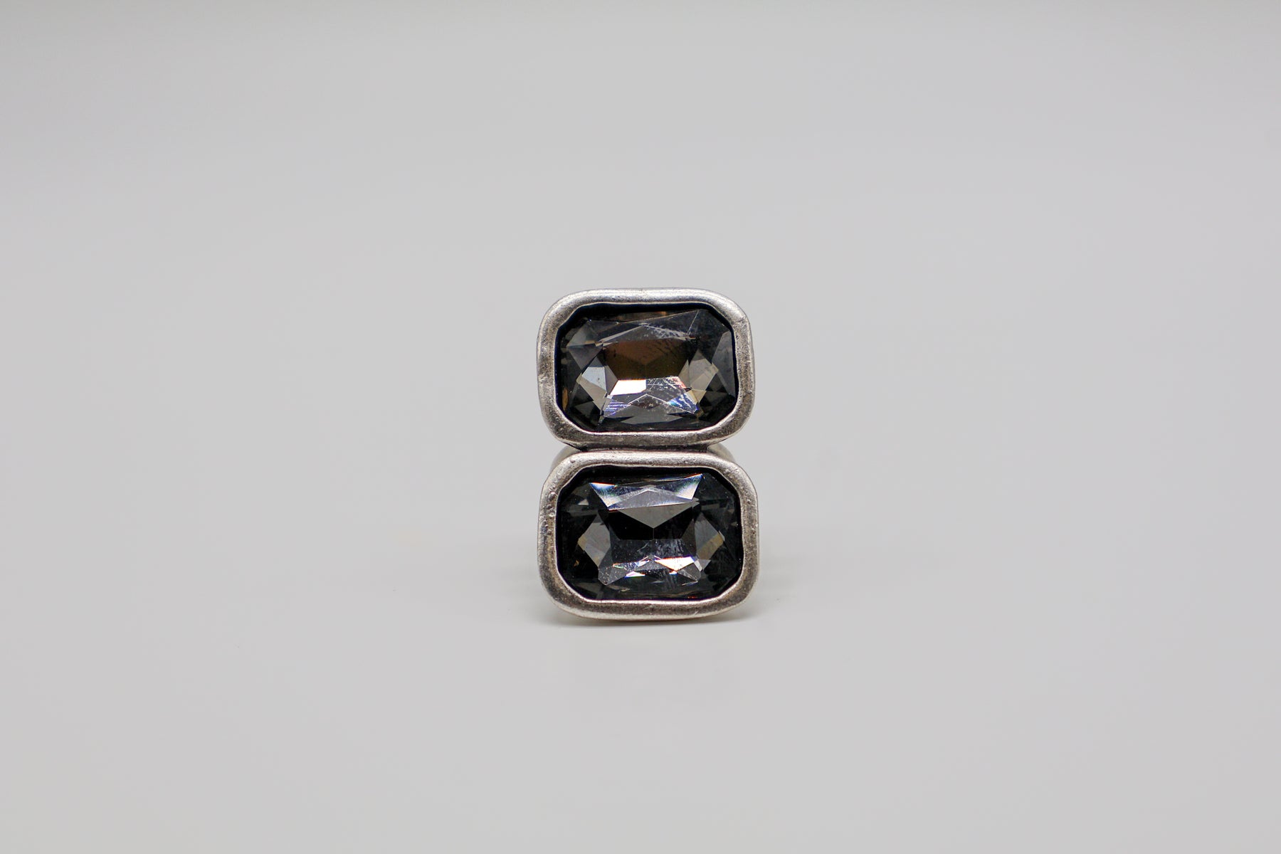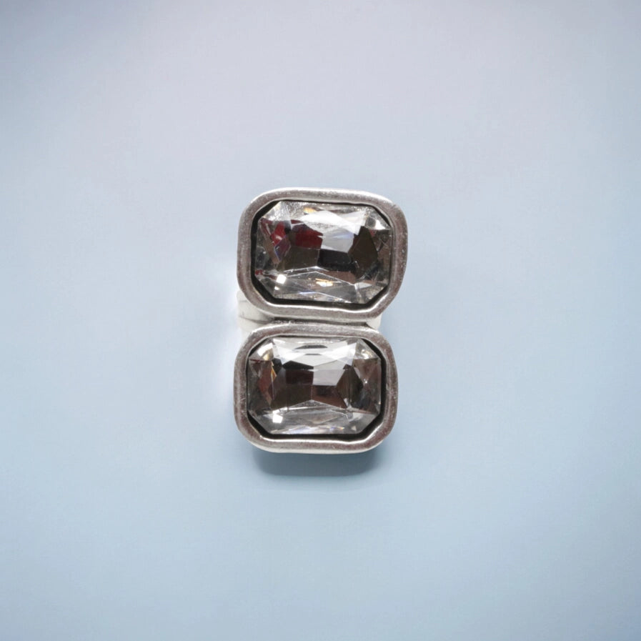 A striking blend of bold design and effortless wear, this adjustable ring showcases two brilliantly faceted stones set in a modern pewter frame. Each stone catches the light beautifully, creating an eye-catching shimmer that elevates both casual and dressy looks. The open-back adjustable band ensures a comfortable, customizable fit while keeping the style sleek and contemporary. A unique statement piece that adds subtle glamour to everyday elegance.
