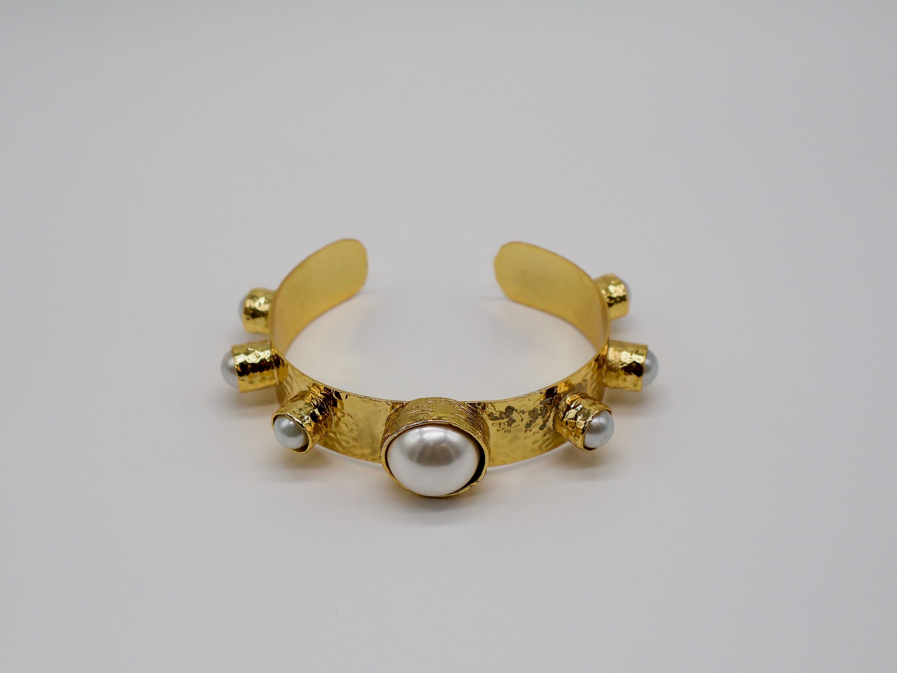This stunning cuff bracelet blends timeless elegance with a bold, sculptural feel. The hammered metal band offers rich texture and dimension, creating a handcrafted look that feels both classic and modern. Raised pearl-like accents surround a prominent center detail, giving the piece a regal, heirloom-inspired quality. With its open cuff design, it slips on effortlessly and brings instant sophistication to everything from everyday outfits to special-occasion ensembles.