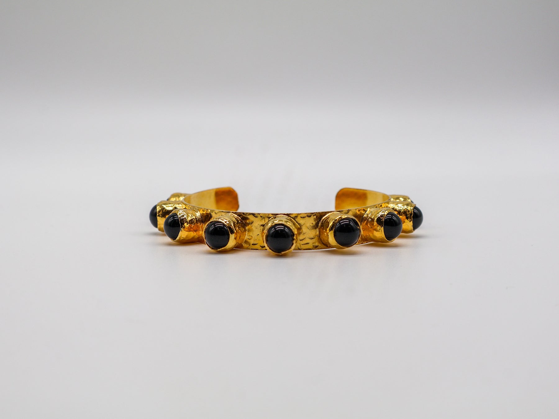 Artful texture meets bold elegance in this sculptural cuff bracelet. Its hammered metal band creates a handcrafted feel, while a row of smooth rounded stones adds striking dimension and refined drama. Each stone is individually set atop textured metal detailing, giving the piece a regal, statement-making presence. Lightweight yet impactful, this cuff offers a modern edge with timeless sophistication—perfect for elevating everyday ensembles or adding polish to an evening look.