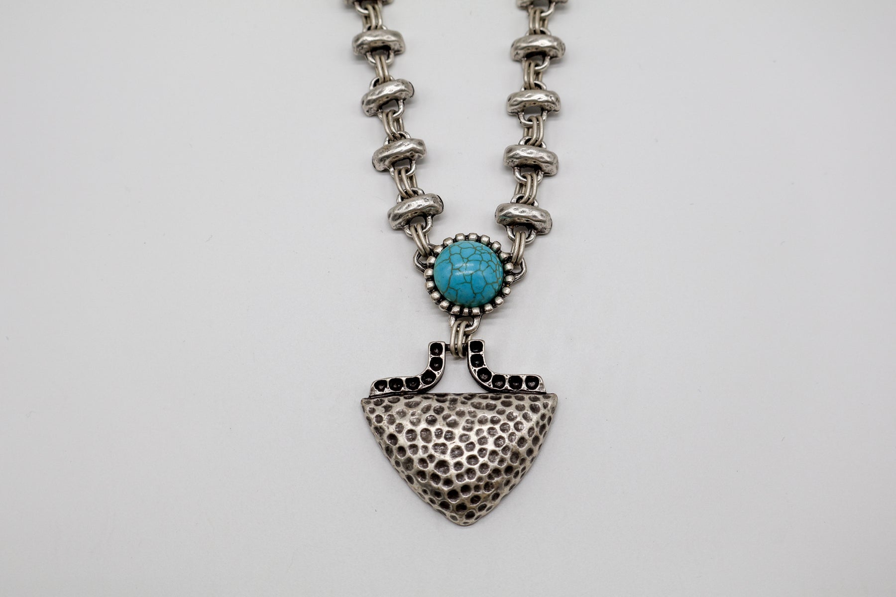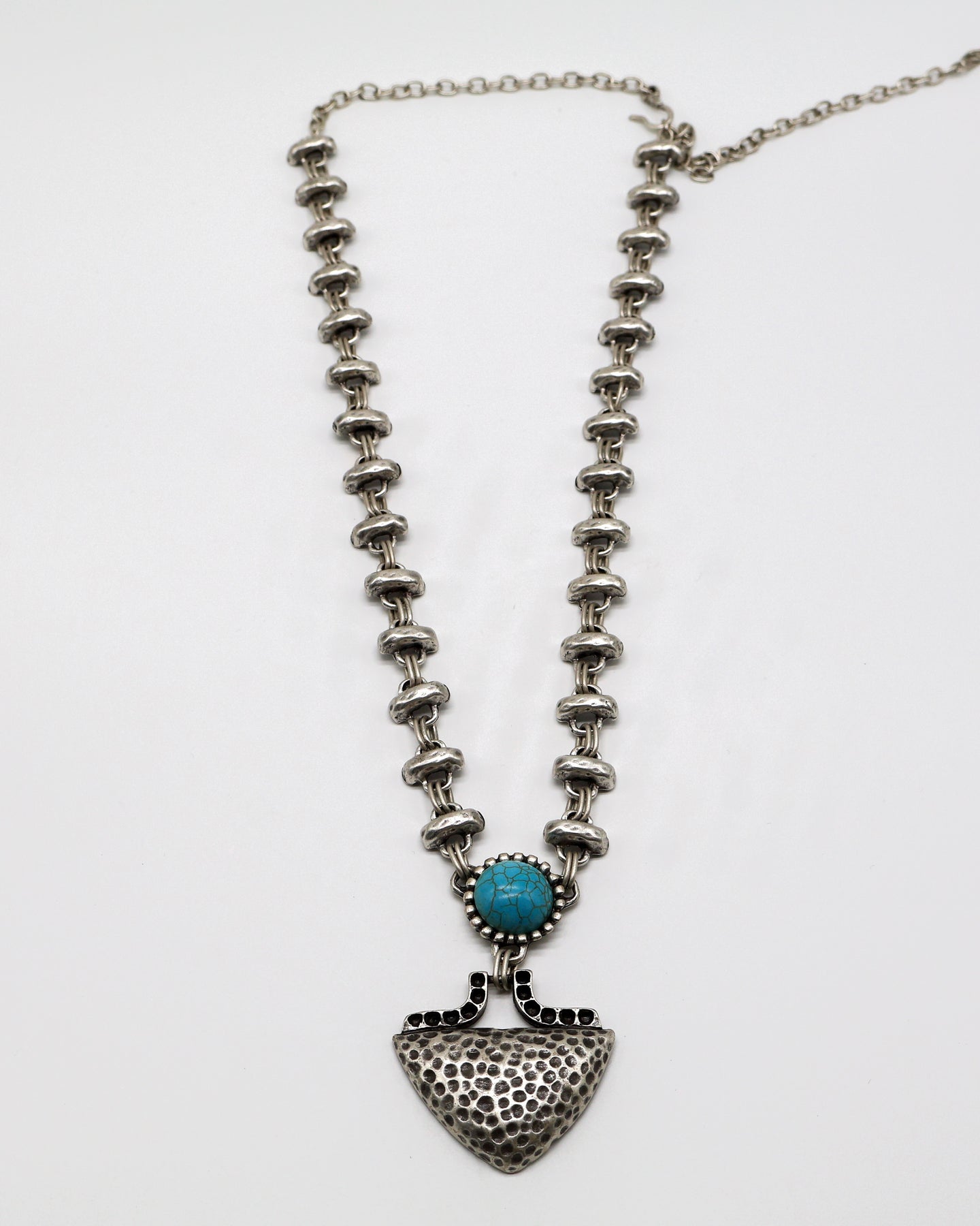 This bold, artisan-inspired necklace combines a distinctive chain design with a striking medallion centerpiece for a look that’s both grounded and expressive. The textured pendant brings handcrafted charm, while the sculpted links add structure and visual interest throughout the neckline. Finished with a dimensional accent stone, this piece offers a touch of boho sophistication that elevates everyday outfits and enhances dressier ensembles alike. Its weighty, artistic feel makes it a standout accessory that instantly adds character and confidence.