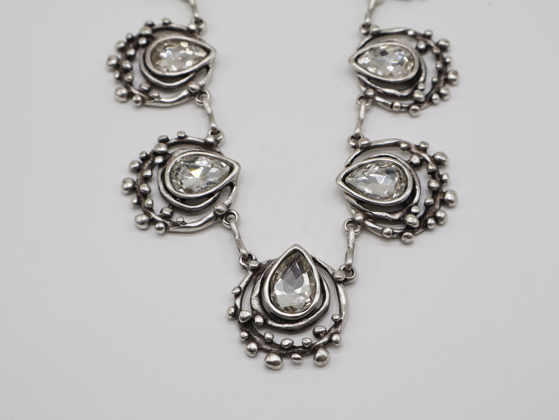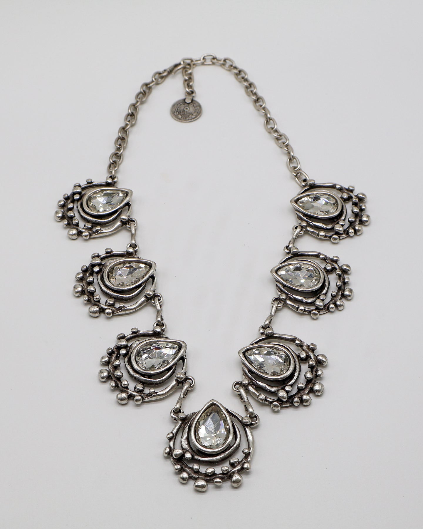 This captivating statement necklace features a series of sculpted teardrop pendants, each centered with a faceted crystal that reflects the light with stunning clarity. Textured metalwork and delicate bead detailing create a dimensional, artisan look that feels both bold and refined. Designed to make an impression, this necklace elevates any outfit with its radiant sparkle and beautifully crafted silhouette.