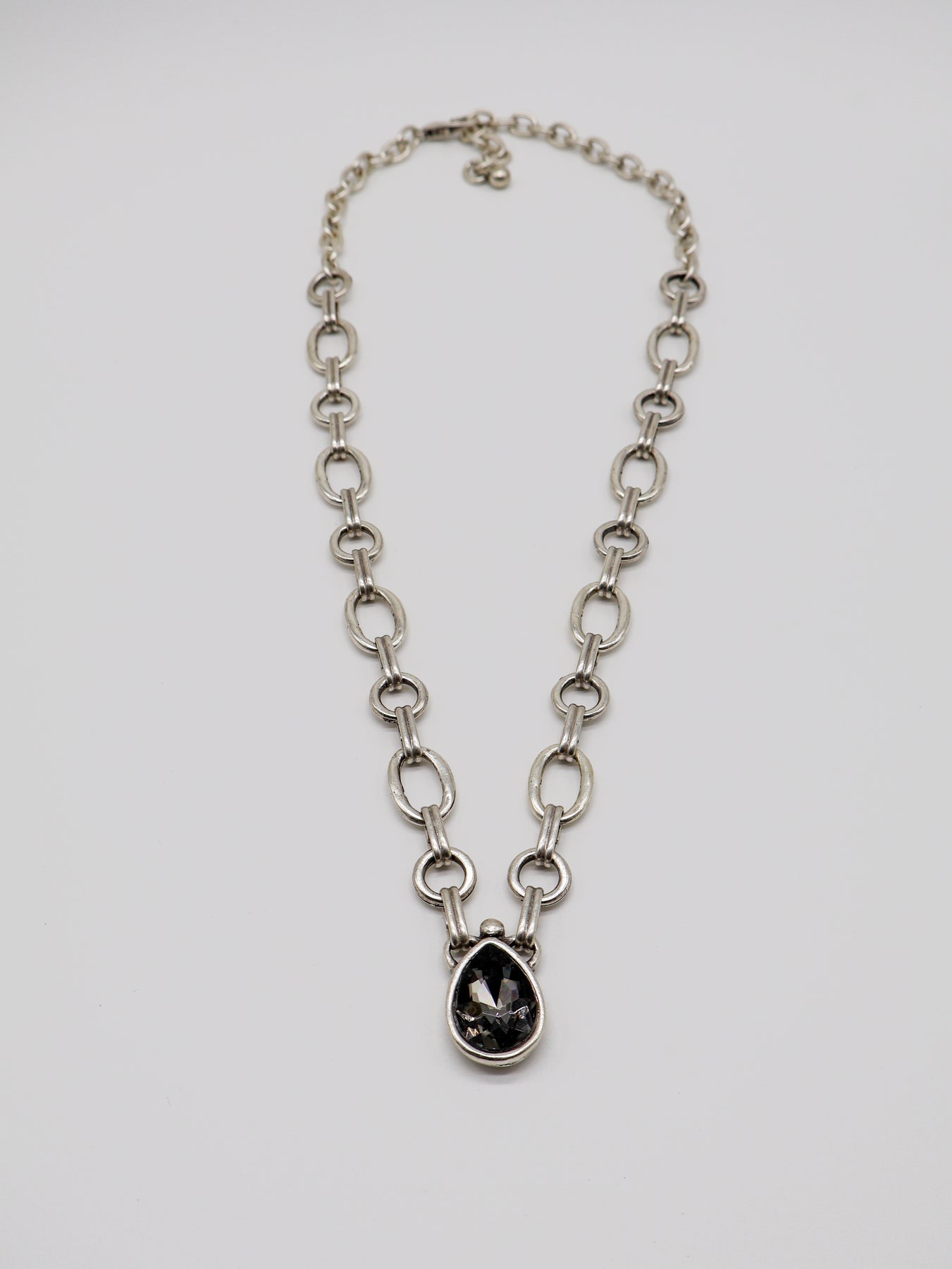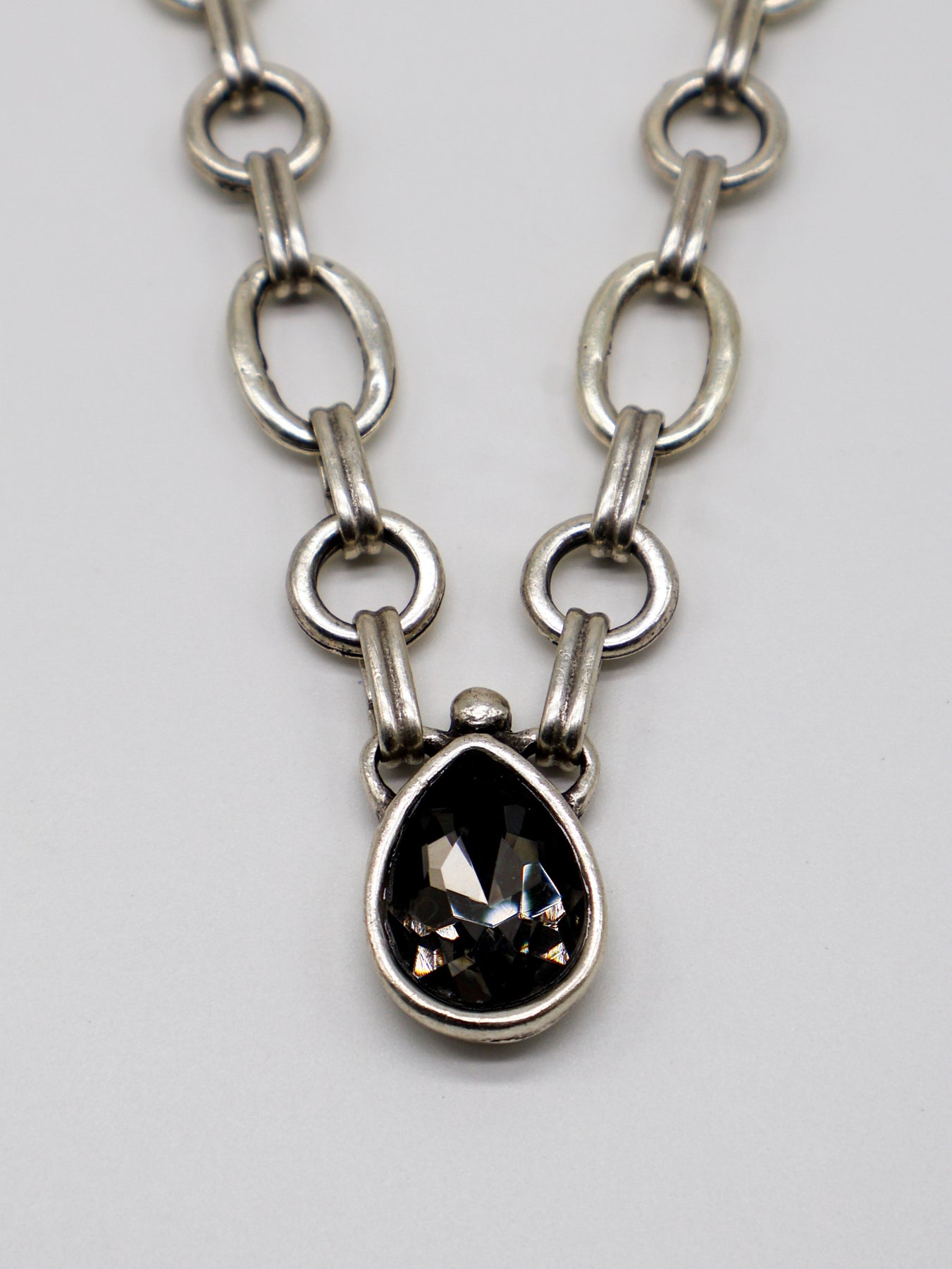 This elegant necklace features a bold chain paired with a faceted teardrop pendant that catches the light with refined brilliance. The sculpted links add modern texture and a touch of edge, while the pendant’s smooth setting creates a beautifully balanced, polished look. Lightweight and easy to style, this necklace brings a sophisticated statement to both everyday outfits and elevated ensembles.