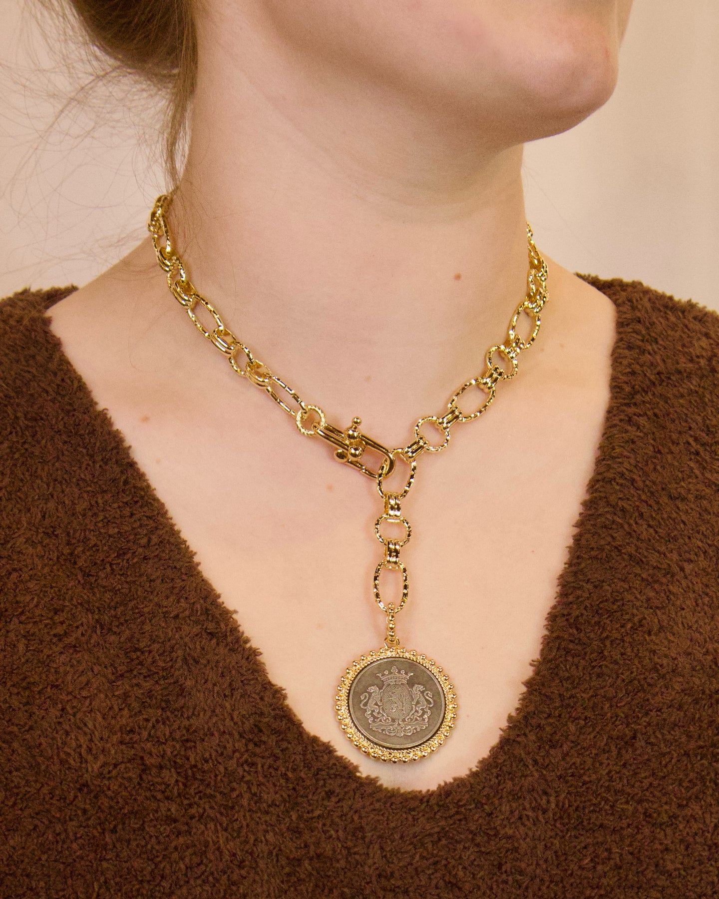 This captivating necklace features a sculpted chain with rich texture and dimension, leading to an ornate coin pendant that brings a timeless, heirloom-inspired feel. The bold links create a striking neckline presence, while the detailed medallion adds artistic depth and refined character. Designed to make a statement whether worn with everyday outfits or polished ensembles, this piece blends classic charm with modern sophistication for an unforgettable finishing touch.