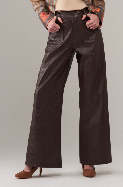 Add an edge of luxury to your look with these sleek embossed vegan leather pants. Crafted with a subtle crocodile texture, this statement-making style offers structure and shine in all the right places. The wide-leg silhouette delivers a modern, elongated line, while the mid-rise waist and front seams enhance the tailored fit. Pair it with a fitted turtleneck or a cropped jacket for an effortlessly elevated ensemble that transitions seamlessly from daytime polish to evening sophistication.