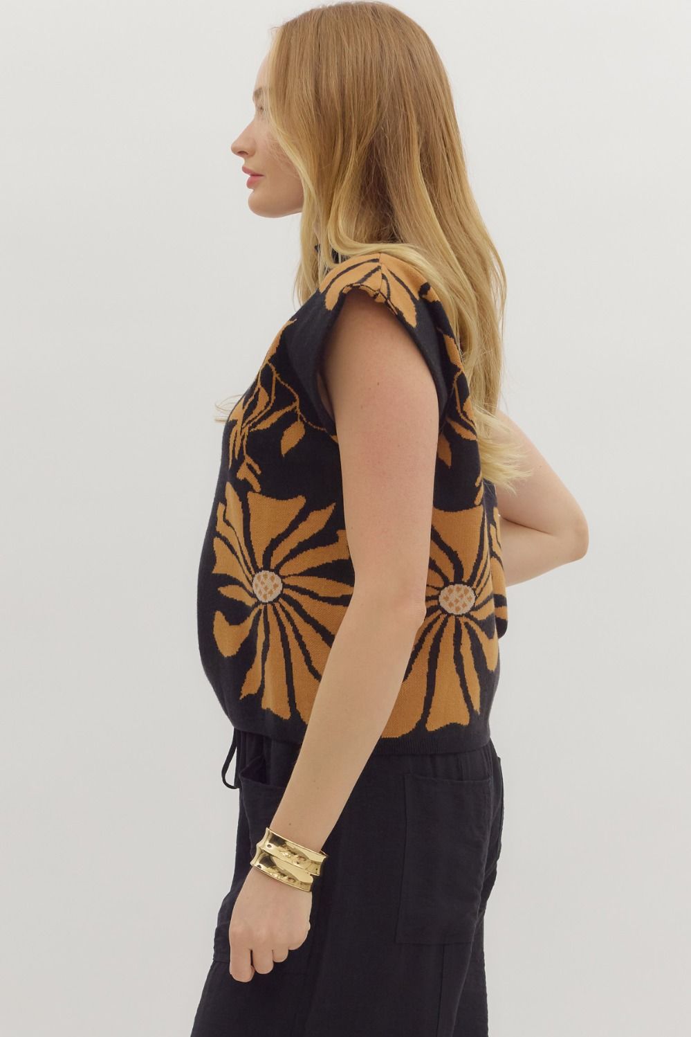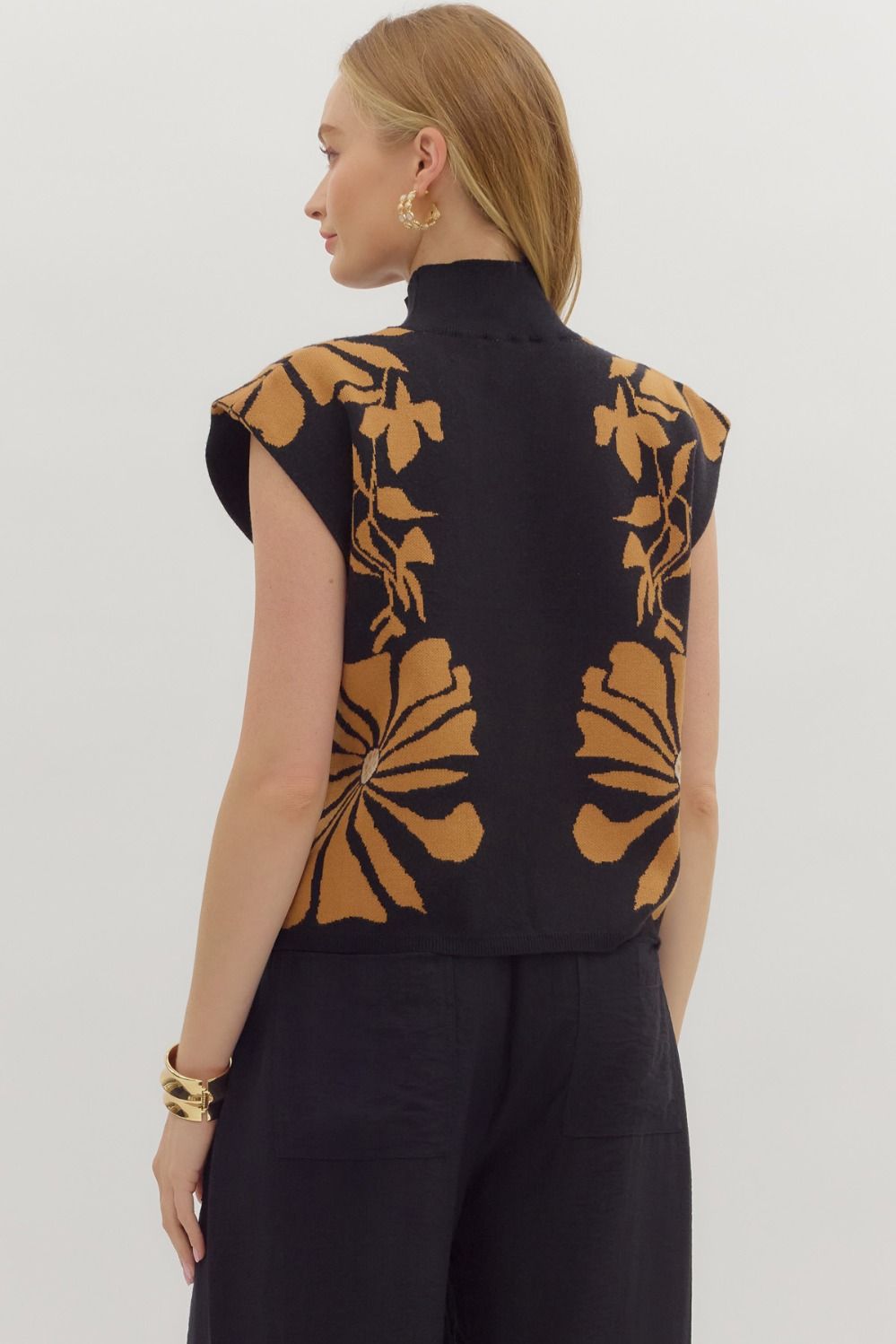 A bold and versatile knit, this sleeveless mock neck sweater adds effortless style to your wardrobe. Featuring a striking oversized floral pattern in a warm golden hue against a sleek black backdrop, it blends modern structure with artistic charm. The soft knit fabric and mock neckline create a flattering silhouette, while the sleeveless design makes it easy to layer under jackets or wear on its own. Perfect for dressing up with tailored trousers or keeping casual with denim.